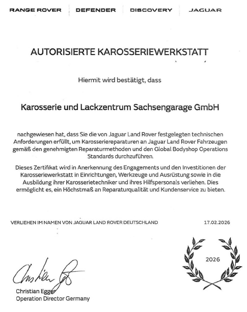 Wir als Karosserie- und Lackzentrum der Sachsengarage in Dresden haben nachgewiesen, dass wir die von Jaguar Land Rover festgelegten technischen Anforderungen erfüllen, um Karosseriereparaturen an Jaguar Land Rover Fahrzeugen gemäß den genehmigten Reparaturmethoden und den Global Bodyshop Operations Standards durchzuführen. Hier geht es zum Zertifikat.